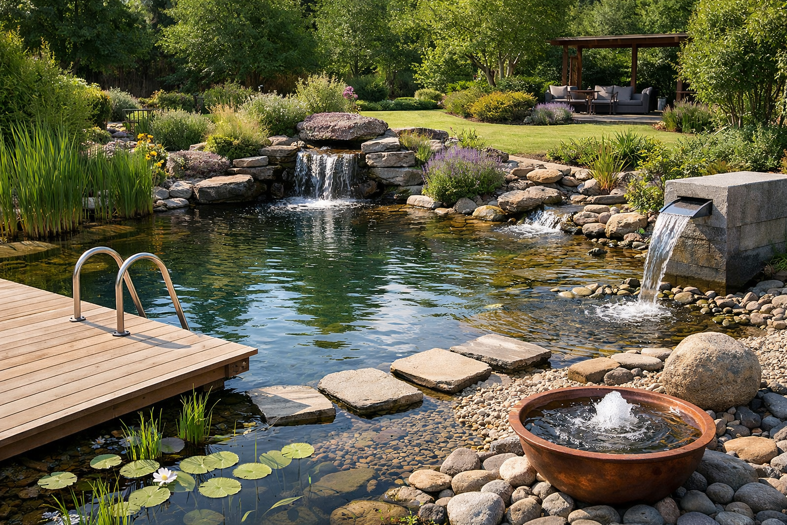 Koupací jezírka, biotopy a zahradní vodní prvky – od geodetického zaměření přes návrh tvaru, hloubek a regeneračních zón až po výběr materiálů, filtračních prvků a napojení na okolní terén.